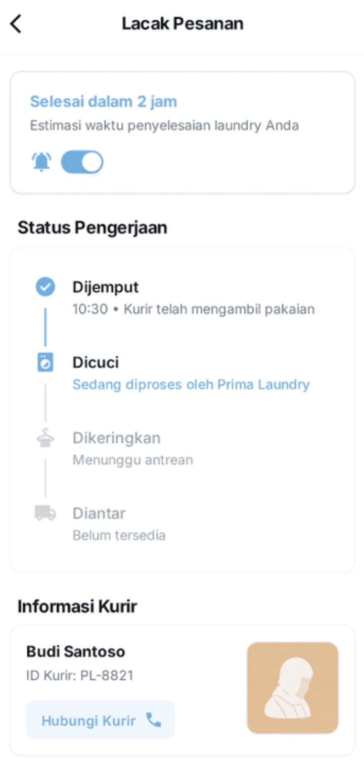 Pantau proses laundry secara langsung: Dijemput, Dicuci, Dikeringkan, Diantar Tidak perlu bertanya manual ke admin.